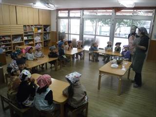 もし、給食室から火事が起こった時に、どんなふうに避難するのか園長さんから大事なお話を聞きました。