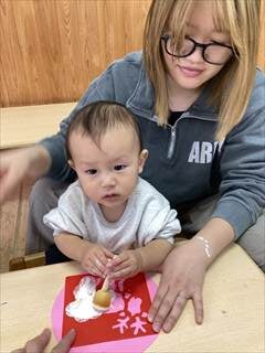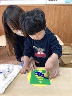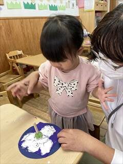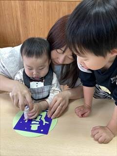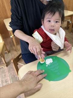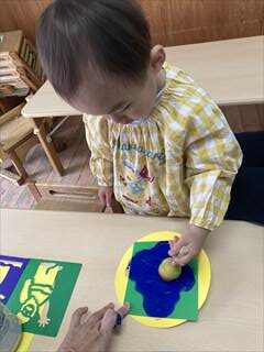 絵の具を「とろ~り」お皿に入れると、思わず手を伸ばして触れてみたり、「これ何かな?」と不思議そうにしながらも好奇心旺盛で触れてみたりと、可愛い姿が沢山見られました。手元をしっかり見ながら丁寧にスタンピングする子たちばかりで、嬉しいびっくり!でした。