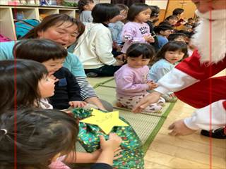 なんとサンタクロースの登場にみんな大歓声!!優しい笑顔と挨拶のサンタさんに釘付けでした。そんなサンタさんと手遊びをして遊んだあとは、各クラスへのおもちゃと、一人ひとりにクッキーのプレゼント🎁大喜びで受け取っていましたよ。