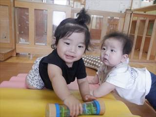 0歳児もみじ組はしっかりハイハイをして顔をぐっとあげてキョロキョロと周りを見渡していますよ!