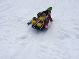 でもそこはぐっと我慢して、まずは民宿のあったかいカレーライスで腹ごしらえ☆お腹を満たしていざ出発!すぐ横の雪山はほぼ貸切り状態!そりに乗って斜面をどんどんすべるみんな!風にのる気持ち良さ、滑り降りたときの楽しさで大笑い!!こけてもぶつかってもそれがまた面白い!!何度も何度もくりかえし登ってはすべって・・を繰り返しました。中にはオリジナルな滑り方を考案したお友だちもいましたよ!