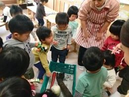 ※年末は、京野菜の堀川ごぼう、金時にんじん、まる大根をこどもたちにみせました!「おっきぃ~!」とびっくりするみんな。特に5歳児ゆりぐみさんは、生活発表会でそれらにちなんだお話を演じたので親しみを感じていましたよ!給食のときは、「これ○○やな~」「おいしい!」と大喜びでした!!