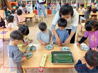 3歳児さくらぐみ:はさみねぎ切り、こんにゃくちぎり