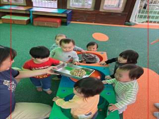 0歳児もみじぐみ:きのこほぐし、小松菜ちぎり