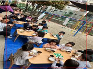 力を合わせてできたあつあつの豚汁はと~ってもおいしかったですよ!幼児クラスは園庭で食べました★